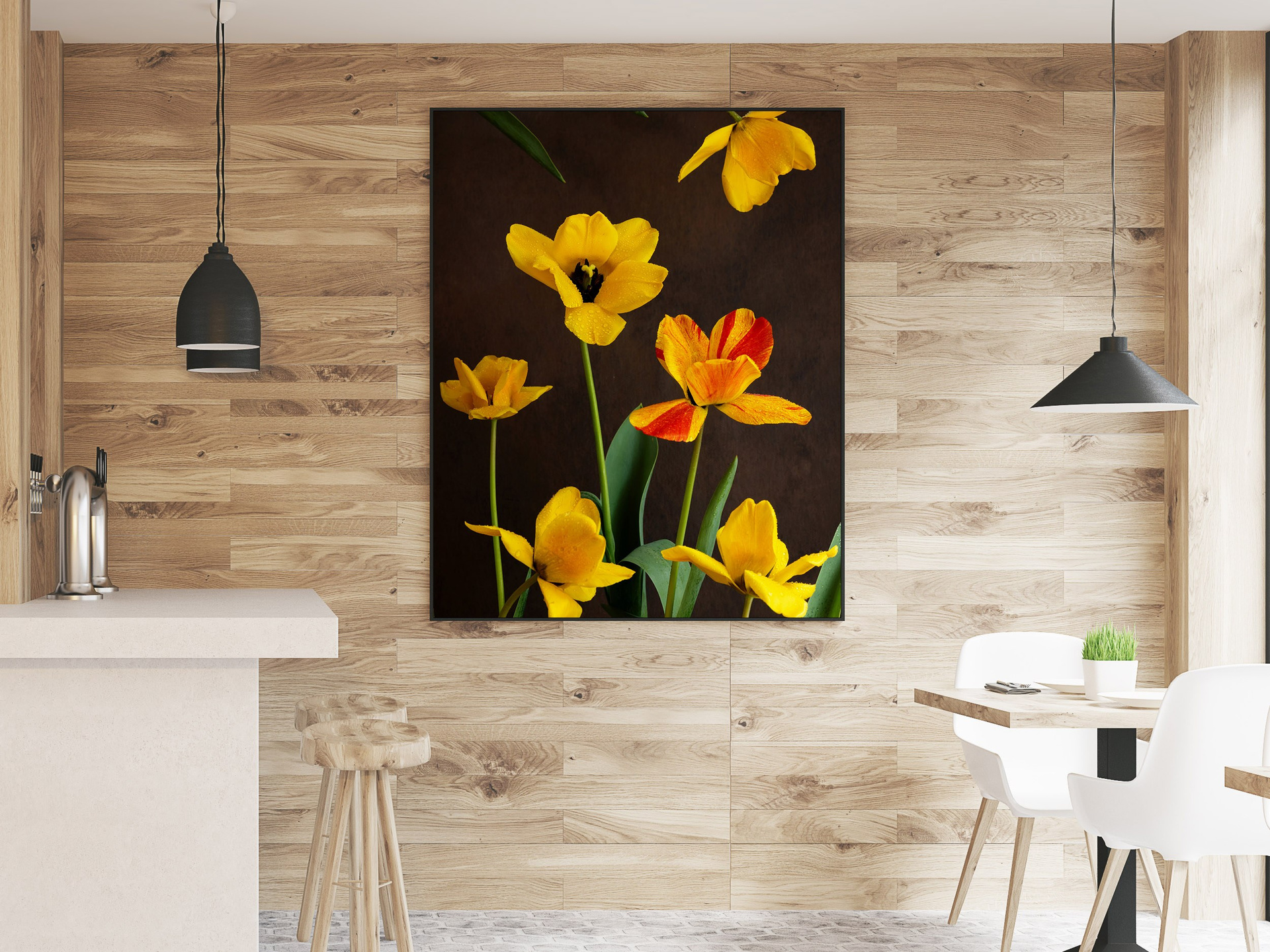 Yellow Mood is a feeling you can’t help but notice. The tulips stretch upward, opening gently as if soaking in the morning. Their hues — from lemon to golden honey — shift like rays of light through sheer fabric.